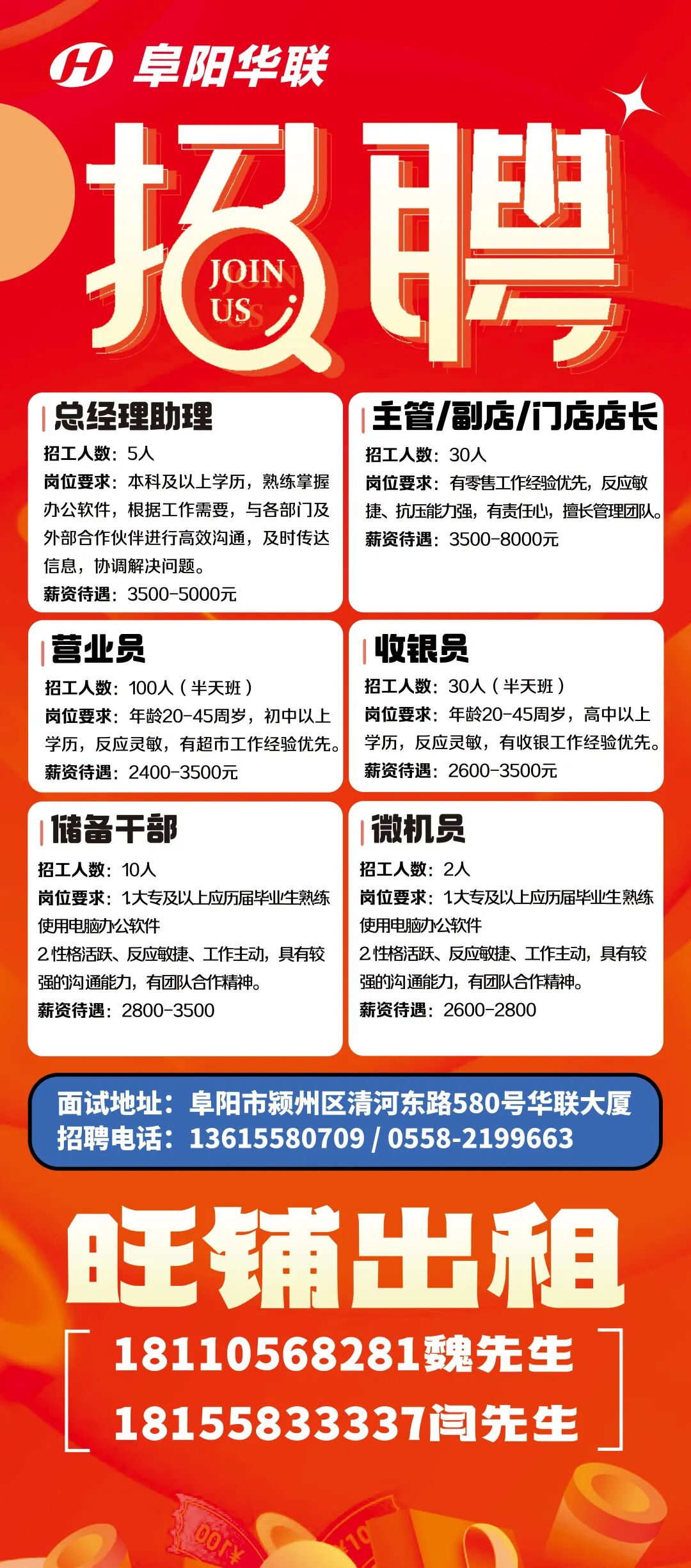 如果你正在寻找一个稳定、有成长、被尊重的职业舞台,请携带你的简历与热情,直接前往阜阳华联大厦八楼人事部,与我们面对面,聊聊你的未来。